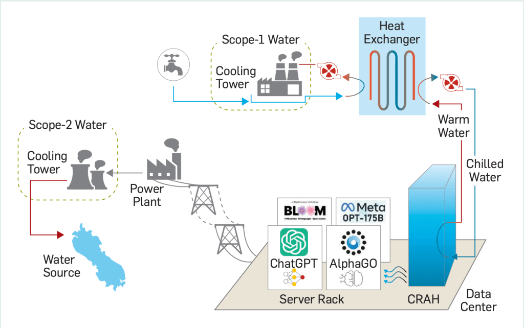 These cooling systems also demand constant access to immense amounts of fresh water. The image below (taken from Li et al., 2025) showcases two of the main ways that AI data centers utilize water. Scope-1 (at the top) illustrates how local water resources are used for on-site liquid cooling: Chilled water passes through server racks, absorbs heat from hardware, and is re-cooled using a heat exchanger (which itself draws cold water from a cooling tower). Scope-2 (lower-left) visualizes off-site water demands, whereby water is supplied to the power plants that supply their massive electricity needs.